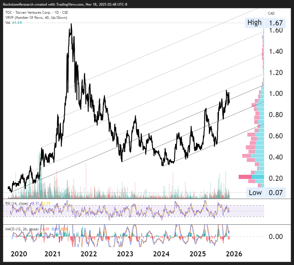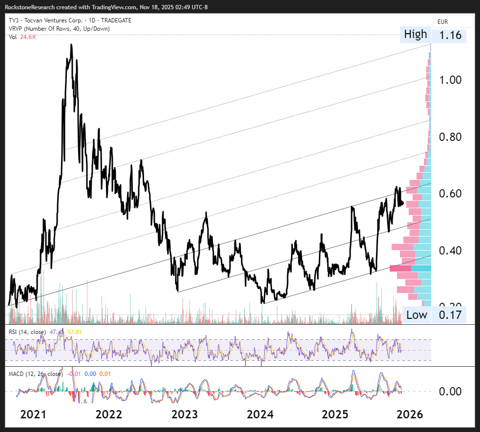 Disclosure of Interests and Legal Notice: Nothing in this report should be construed as an invitation to buy or sell securities. Rockstone, its owners, and the author of this report are not registered broker-dealers or financial advisors. Before investing in securities, you should always consult your financial advisor and a registered broker-dealer. Never make an investment decision based solely on online or printed reports, including reports from Rockstone – particularly when it comes to small, thinly traded companies. The author of this report, Stephan Bogner, received compensation from Tocvan Ventures Corp. in the amount of 19,000 CAD for a period of 3 months. In addition, he holds securities of Tocvan and will therefore also benefit from increased trading volume and share price appreciation. This represents a significant conflict of interest that may affect the objectivity of this reporting. The author may buy or sell securities of Tocvan at any time without notice, which may give rise to additional conflicts of interest. This report should be understood as a promotional publication and does not replace individual investment advice. All information is current as of the date of publication and is subject to change without notice. Liability for financial losses resulting from investments made on the basis of this report is excluded. The views of Rockstone and the author regarding the companies presented in this report reflect solely their own assessments and are based on information from public sources deemed reliable. Rockstone and the author have not conducted independent due diligence. Neither Rockstone nor the author guarantees the accuracy, completeness, or usefulness of the content, nor its suitability for any particular purpose. There is likewise no guarantee that the companies mentioned will perform as expected, or that comparisons with other companies will prove valid. Please read the full disclaimer carefully. If you do not agree with it, do not use this website or report. By using the website or this report, you agree to the disclaimer, regardless of whether you have read it in full. The information provided is of a general and educational nature. Data, tables, figures, and images, unless otherwise indicated or linked, originate from Tradingview.com, Stockwatch.com, Tocvan Ventures Corp., and publicly available sources.