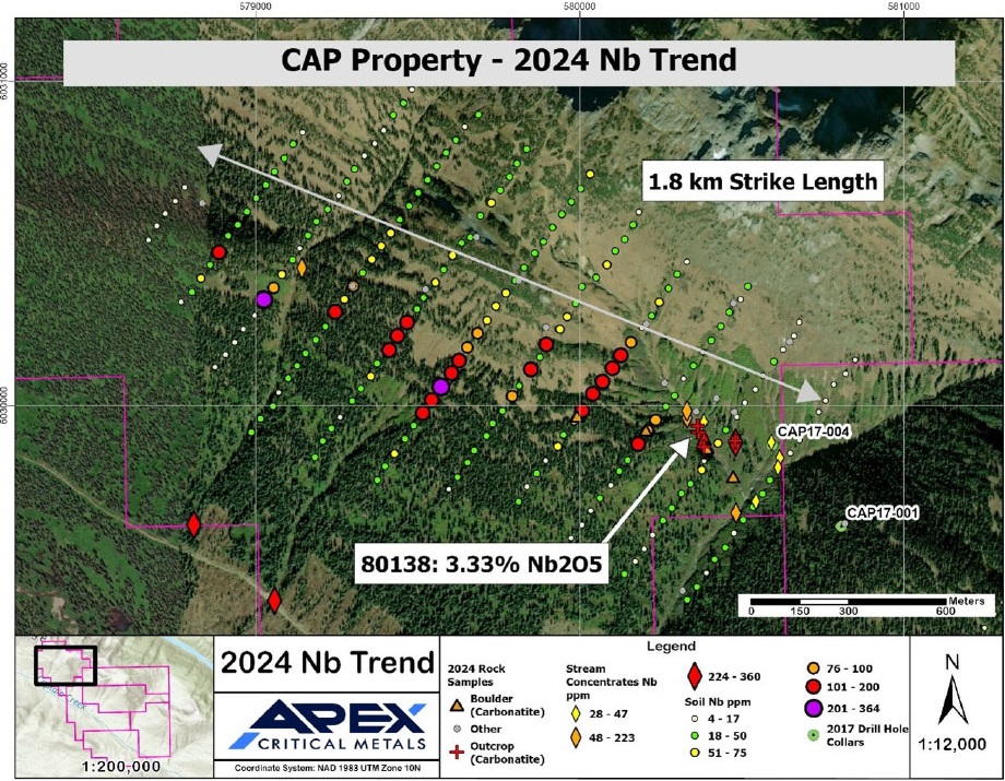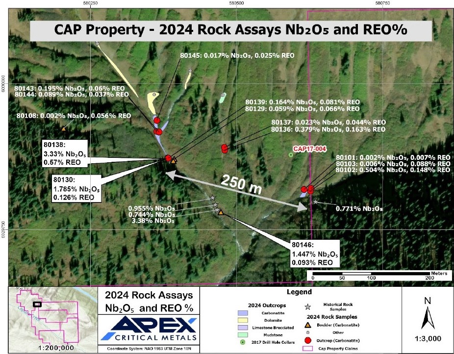 “The 2024 summer exploration program was completed during July 2024, with a total of 32 rock samples, 373 soil samples and 26 stream concentrate samples collected. The objectives were to validate and expand upon previously identified niobium mineralization from historical surface samples and drilling in 2017, which intersected 0.51% Nb2O5 over 4.01 meters (CAP17-004). All assay results from the 2024 program have been received and the exploration work proved highly successful, with significant results returned from all sampling approaches. The analytical data will be utilized to generate targets for a planned 2025 drill program. Additional details can be found at https://apexcriticalmetals.com/projects/cap-project.“