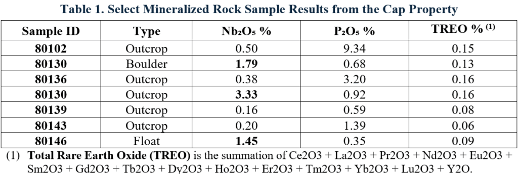 “A total of seven (7) of the fourteen (14) carbonatite grab samples collected from the Cap Property during the 2024 exploration program returned niobium values exceeding 0.1% Nb2O5, with two (2) boulder samples assaying 1.45% and 1.79% Nb2O5 and one (1) outcrop sample assaying 3.33% Nb2O5 The mineralized outcrops that were mapped and sampled represent a potential strike length of up 250 m, with the largest outcrop exposed at surface over a 75 m x 5 m area, and mineralization remaining open in multiple directions (Figure 1). These rock samples also yielded elevated phosphate, and rare earth oxides (REO) (Table 1).