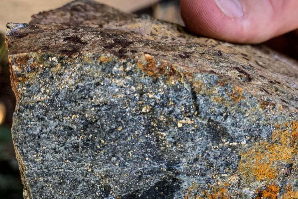 Example of mineralization from Kitimat‘s Jeannette Zone – a silicified andesite hosting sparkling disseminations and veinlets of pyrite and chalcopyrite, evidence of the copper-gold system exposed at surface. Such textures mark the near-surface expression of a much larger porphyry system at depth. (Photo: J. Hanson, October 2020)