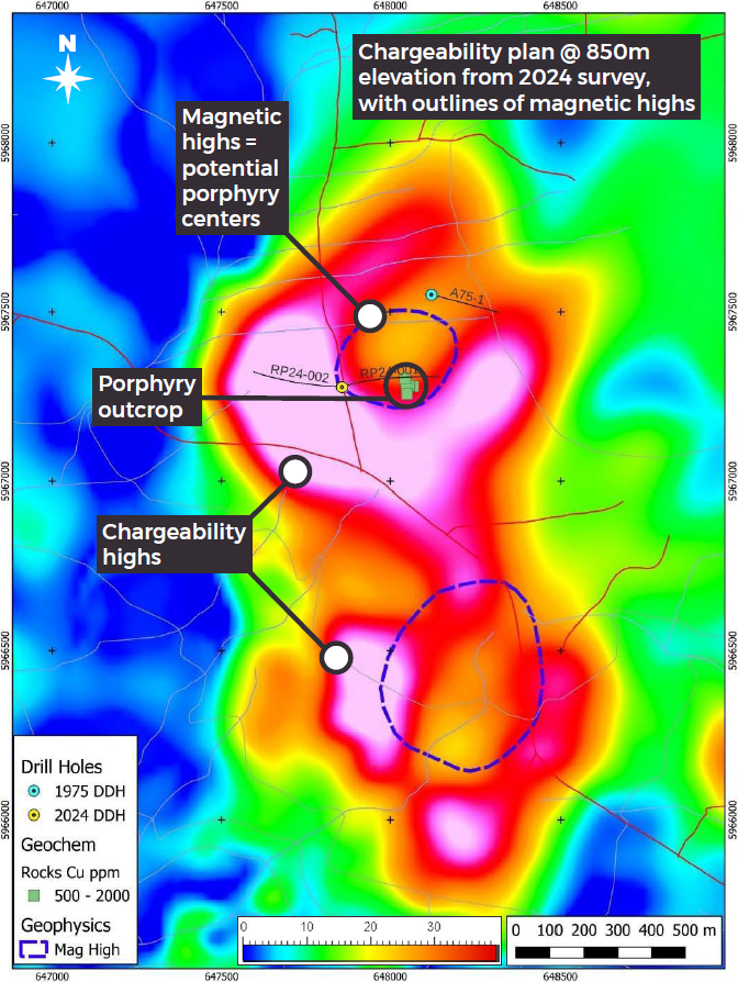 - IP surveys outlining large chargeability features consistent with porphyry systems.