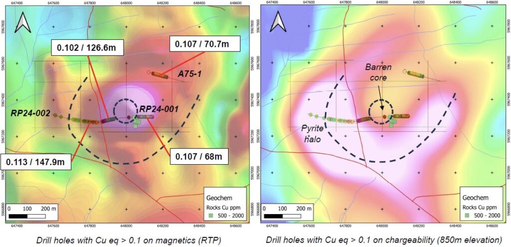 - Central Magnetic Anomaly (CMA): A 5 x 2.5 km ring-shaped anomaly typical of porphyry centers. Only partially drilled, it may host multiple mineralized centers.