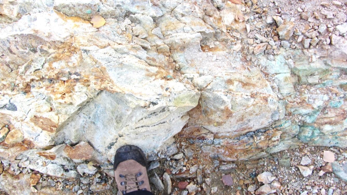 - Outcropping phyllic alteration and porphyry-style quartz veining.