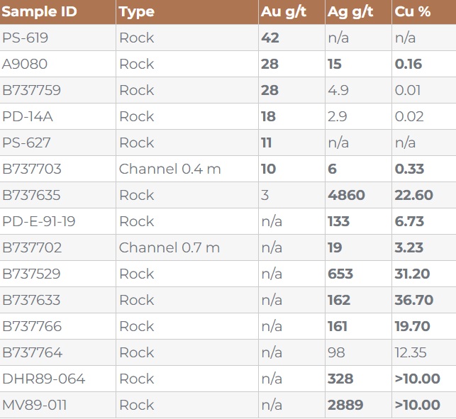 - Copper-gold stockwork veining with assays up to 6.6% copper and 0.6 g/t gold.
