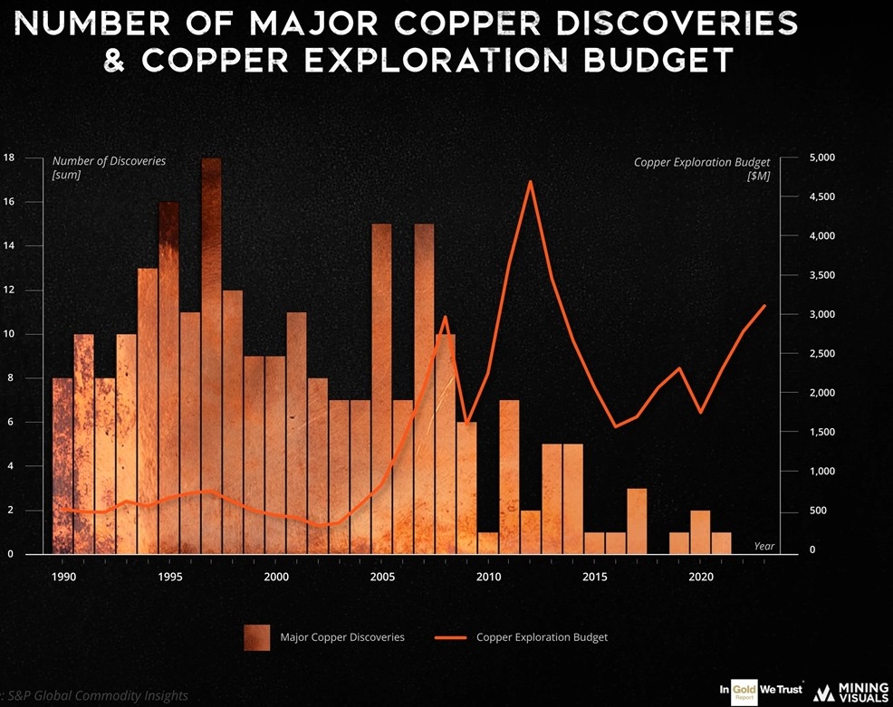 Over the past 25 years, the discovery of new world-class copper deposits has fallen dramatically, even as industry exploration spending has surged. The chart illustrates how large discoveries have trended steadily downward, while mergers and acquisitions (M&A) have accelerated to fill the gap. With fewer genuine discoveries being made, major producers are increasingly forced to grow through consolidation, bidding up the value of existing assets.
