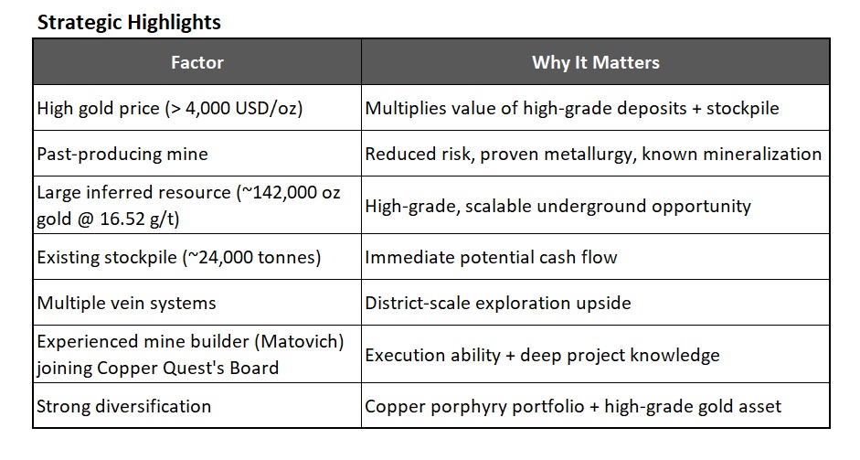 This new balance, long-term copper porphyry growth + short-term high-grade gold upside, positions Copper Quest uniquely in the junior space.
