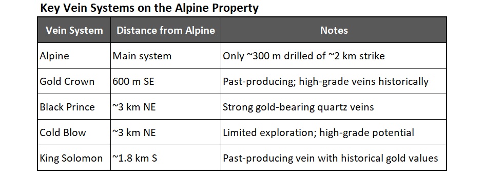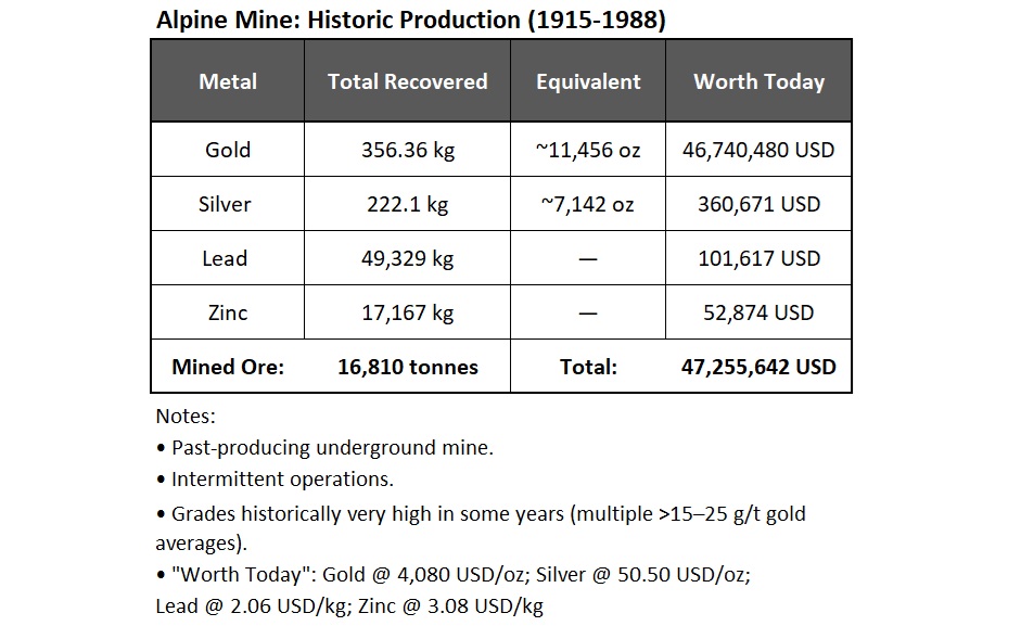 The above tables highlight the core strengths of the Alpine Gold Mine: A high-grade NI 43-101 resource, exceptional historic production, and a sizeable surface stockpile offering rare near-term potential in today’s record gold price environment. With past underground development, meaningful grades, and over 24,000 t of accessible material, Alpine gives Copper Quest a unique opportunity to translate the current gold market into near-term momentum and shareholder value.