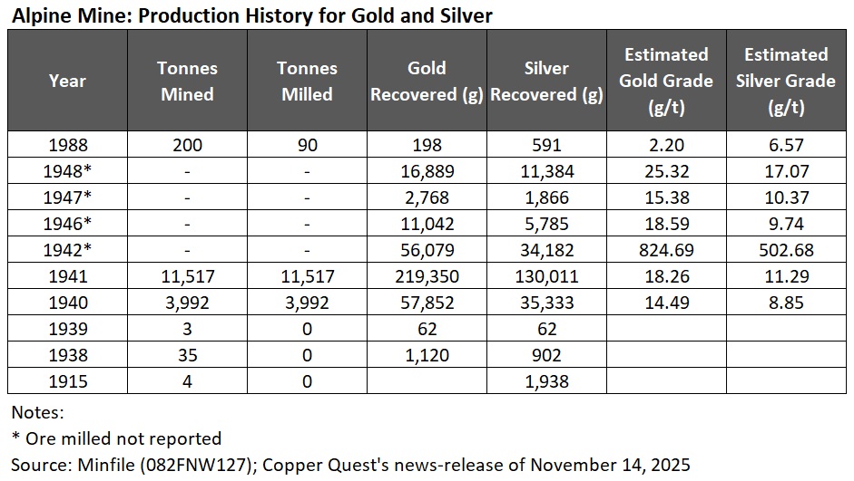 The ~4,612-hectare Alpine Property is ~20 km northeast of the City of Nelson and hosts the former operating underground mine with a recorded production of ~16,810 tonnes of mineralized vein material. This material contained 356 kg of gold, 222 kg of silver, 49,329 kg of lead and 17,167 kg of zinc. The other 4 significant vein systems on the property will also be explored including the Black Prince and Cold Blow quartz veins approximately 3 km to the northeast of the Alpine Mine, the Gold Crown vein system 600 m southeast, and the past-producing King Solomon vein workings 1.8 km to the south. Further information about the Alpine Gold property will be forthcoming in the upcoming weeks. (Excerpts from Copper Quest‘s news-release dated November 14, 2025)