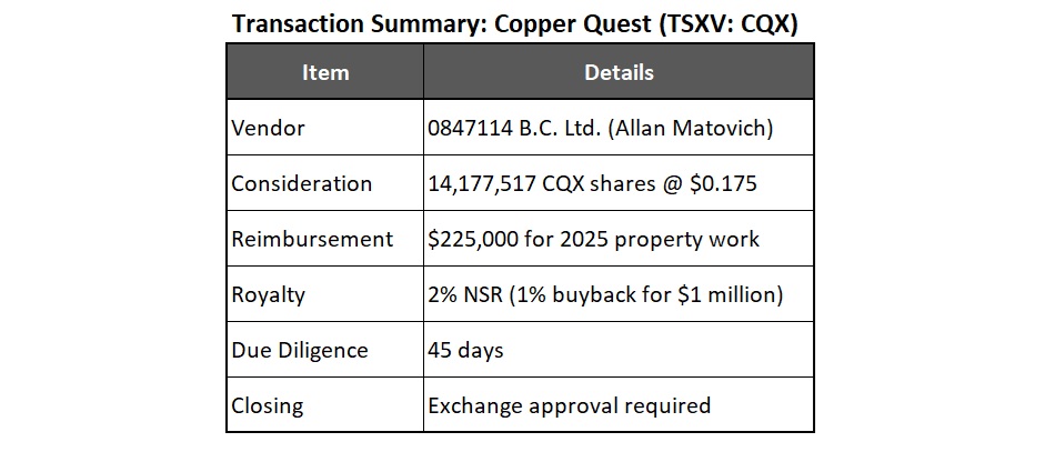 • A major new shareholder with real skin in the game: Allan Matovich and partners will receive 14.18 million shares, currently giving them nearly 20% ownership of Copper Quest.