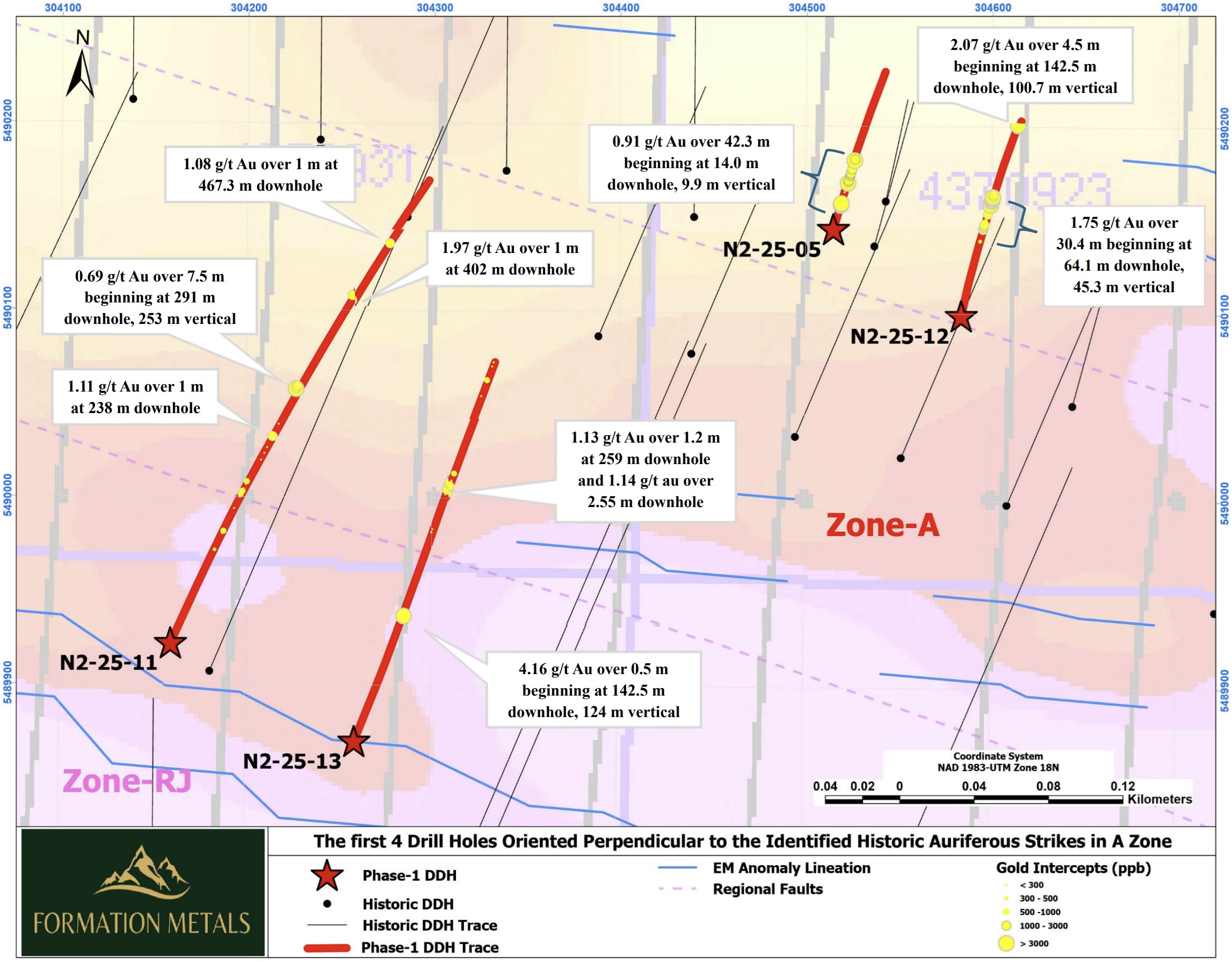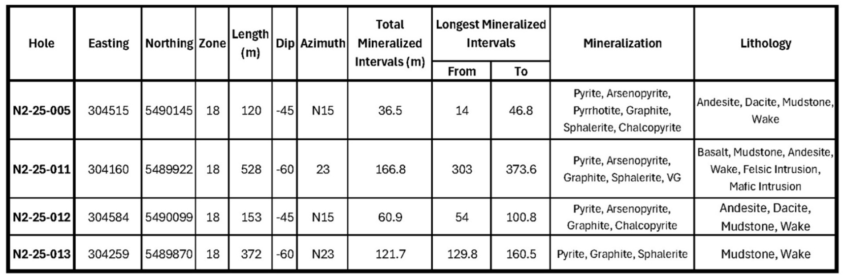 The first batch of drill results cover the first 4 holes with key highlights from N2-25-005 and N2-25-012, supported by additional intercepts in N2-25-011 and N2-25-013.