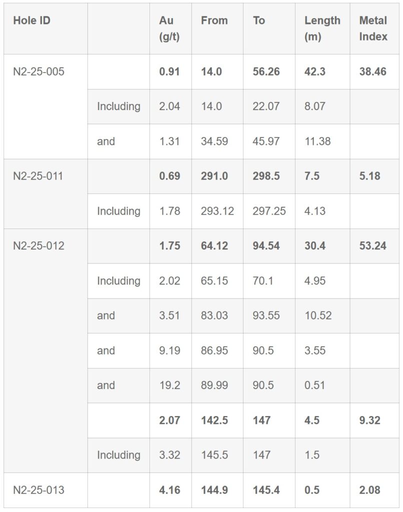 - N2-25-013: 0.5 m @ 4.16 g/t gold (from 144.9 m downhole)