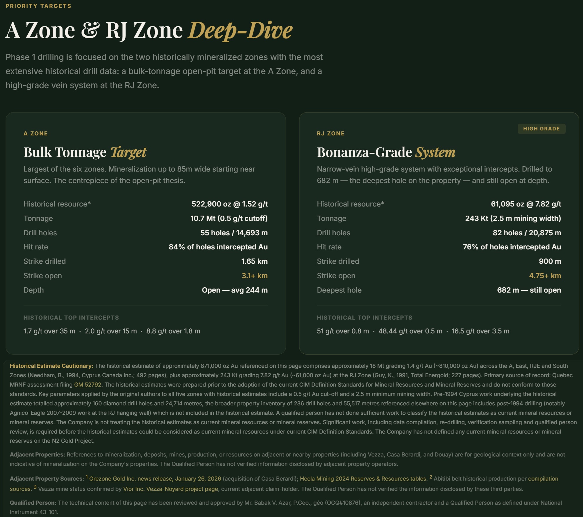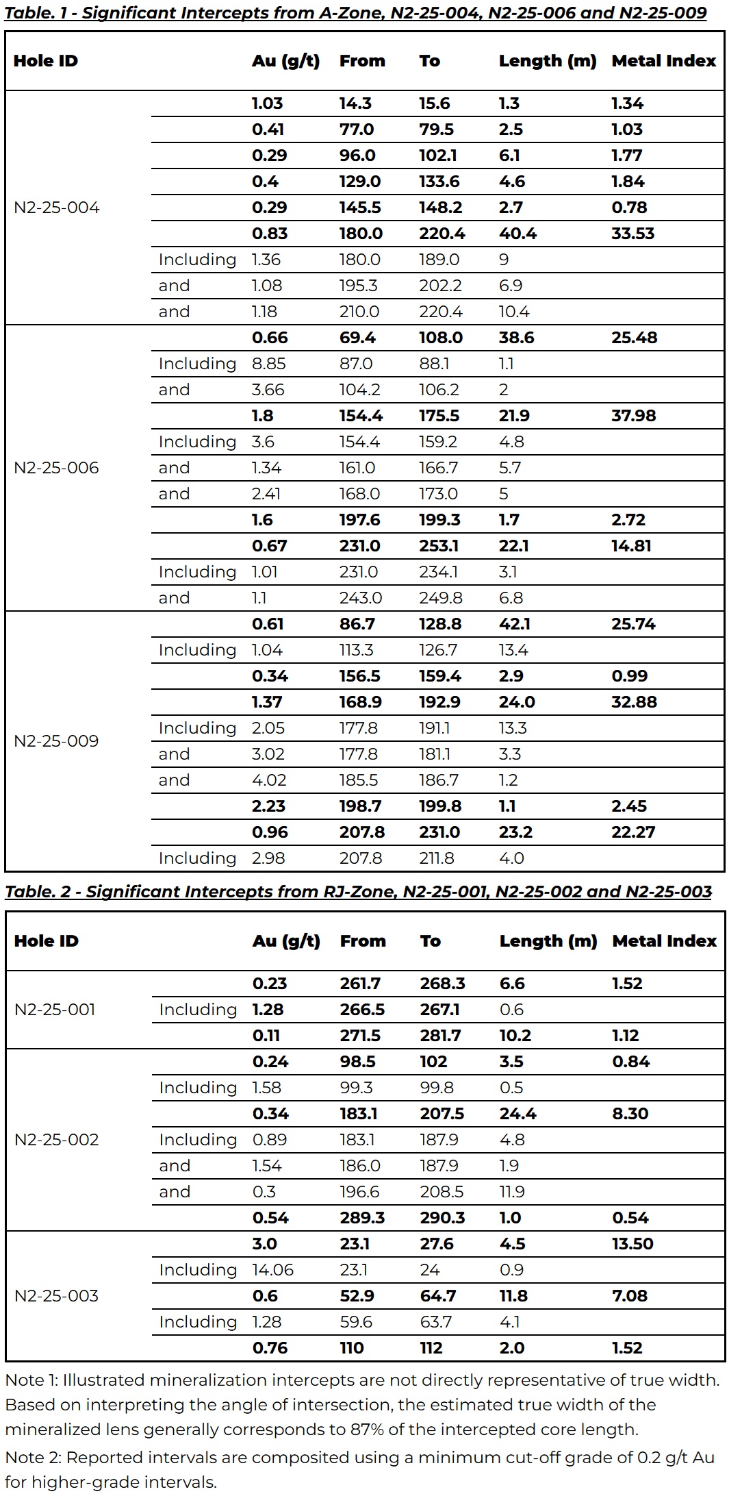 “The Phase 1 results continue to exceed our expectations, with N2-25-004, N2-25-006, and N2-25-009 demonstrating that the A-Zone is a significant open-pit target. The results continue to validate the 55,000+ metres of historical drilling, with drilling not only confirming the historical findings about lithology, mineralization, alteration, veining and structural features, but also notably returning higher consistency, longer auriferous composites, and more valuable mineralization footprints, strengthening the concept of an open pit deposit at N2.”