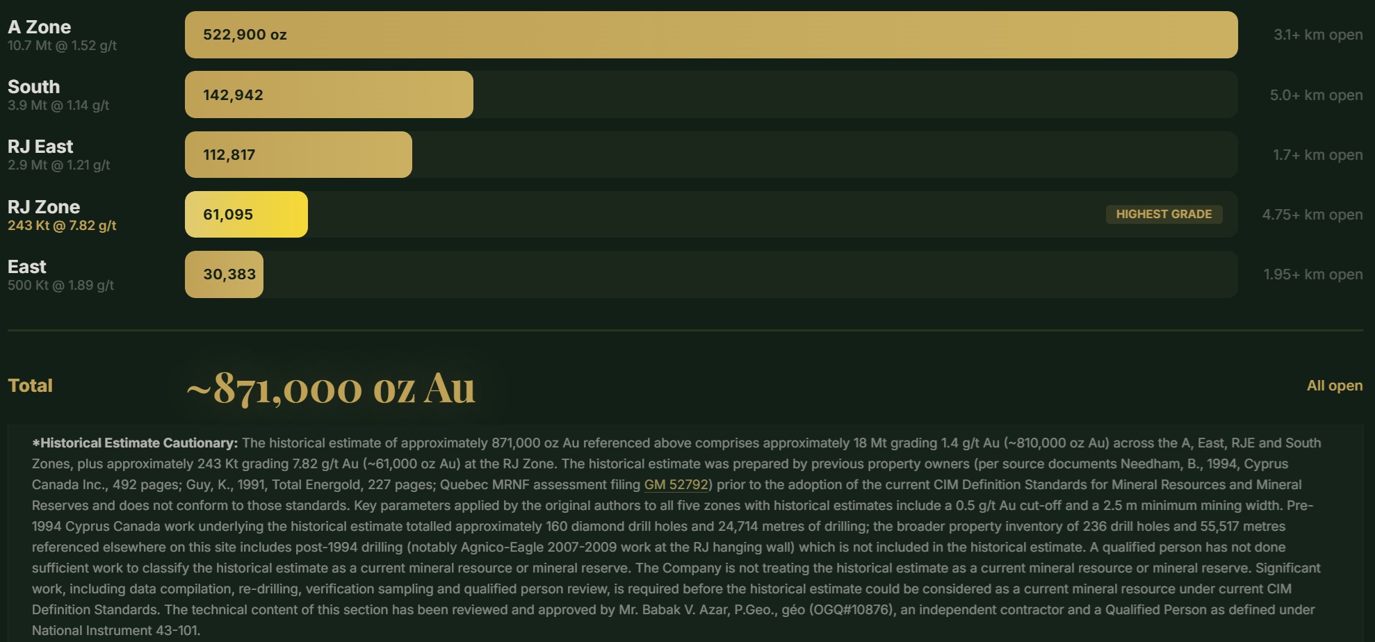 Gold mineralization has been documented across 6 zones at the N2 Project. The historical estimate of ~871,000 ounces of gold* covers 5 of those zones (A, East, RJE, South, and RJ). The sixth zone is the hanging-wall RJ discovery identified by Agnico-Eagle Mines in 2007-2009, which is not included in the historical estimate.