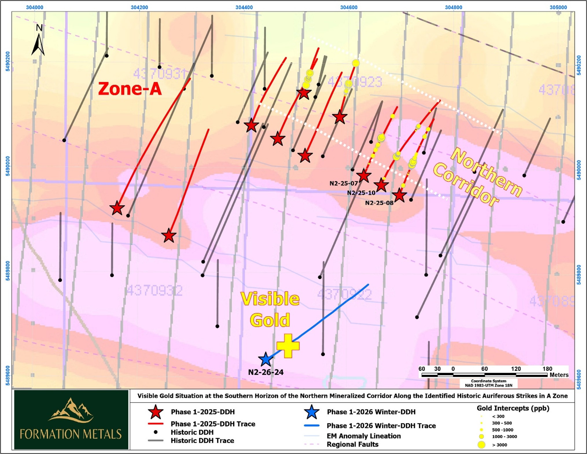 This matters not only because visible gold is a powerful sign of a fertile mineralizing system, but also because of where the hole was drilled. N2-26-24 was designed as a 400 m step-out to the south of previously successful drilling in the A-Zone corridor.