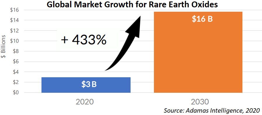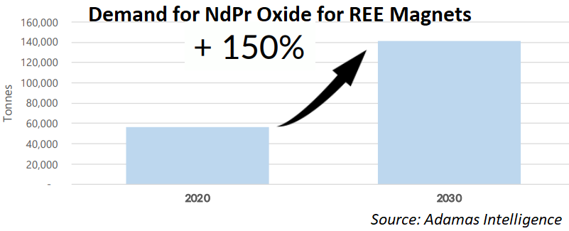 According to Adamas Intelligence, the rapid rise in EV sales is expected to result in a 275% increase in demand for rare earths used in EV motors between 2019 and 2025. According to the European Commission (2020), rare earths (LREE & HREE) are highlighted as having the greatest supply risk of raw materials for key technologies.