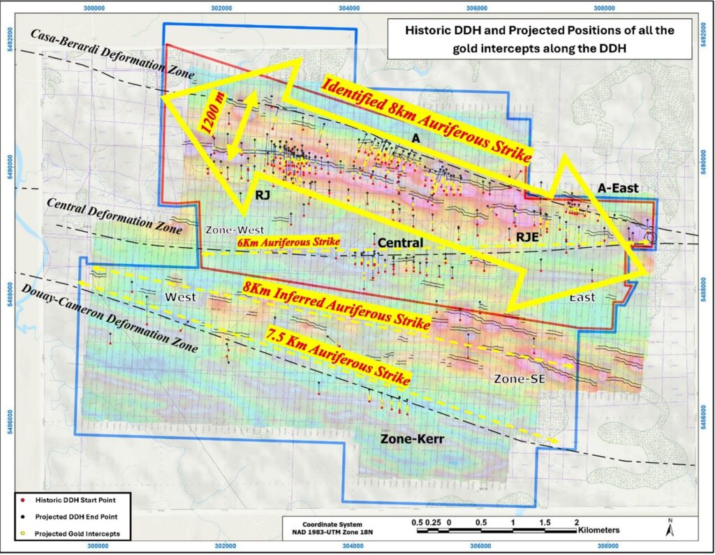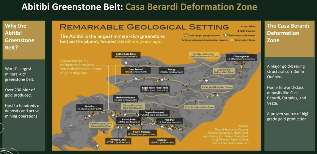 Regional map of the Abitibi Greenstone Belt highlighting the Casa Berardi Deformation Zone, one of Quebec’s most prolific gold-bearing structural corridors, host to multiple world-class gold deposits and past-producing mines exceeding hundreds of millions of ounces in cumulative endowment.
