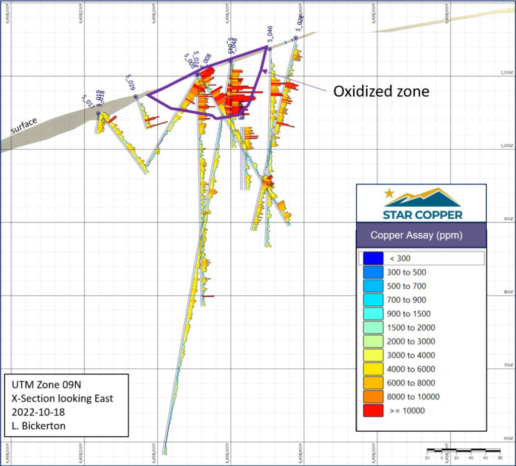 - 72 m @ 0.27% copper + 0.1 g/t gold (S027; from 504-576 m)