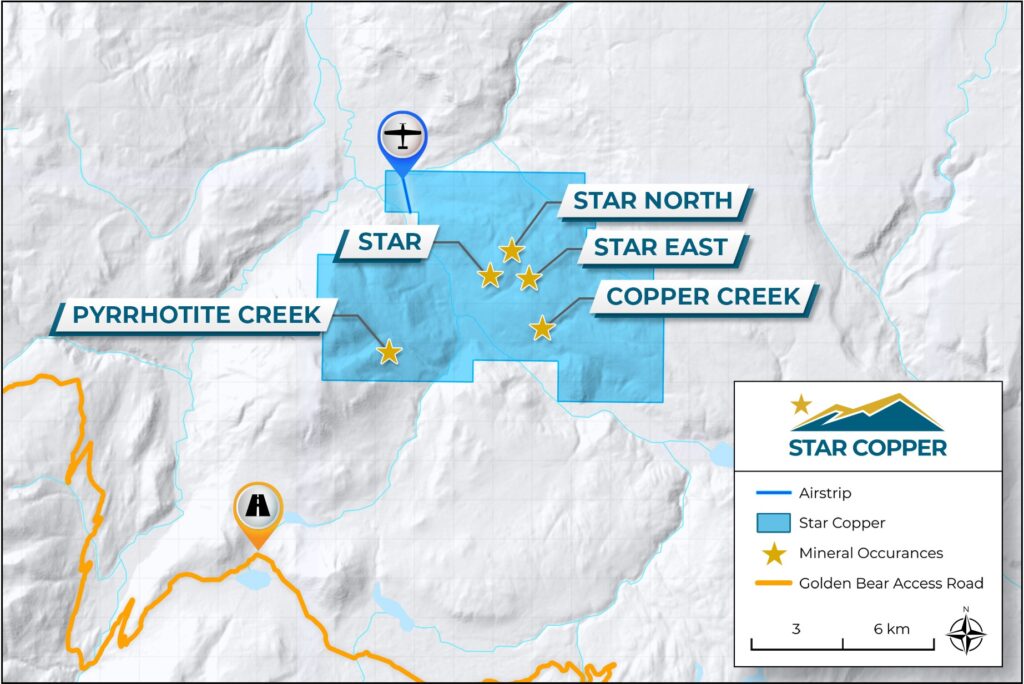 There are 3 main areas of copper-gold mineralization on the property: The Star (including Star East and Star North), Copper Creek, and Pyrrhotite Creek.