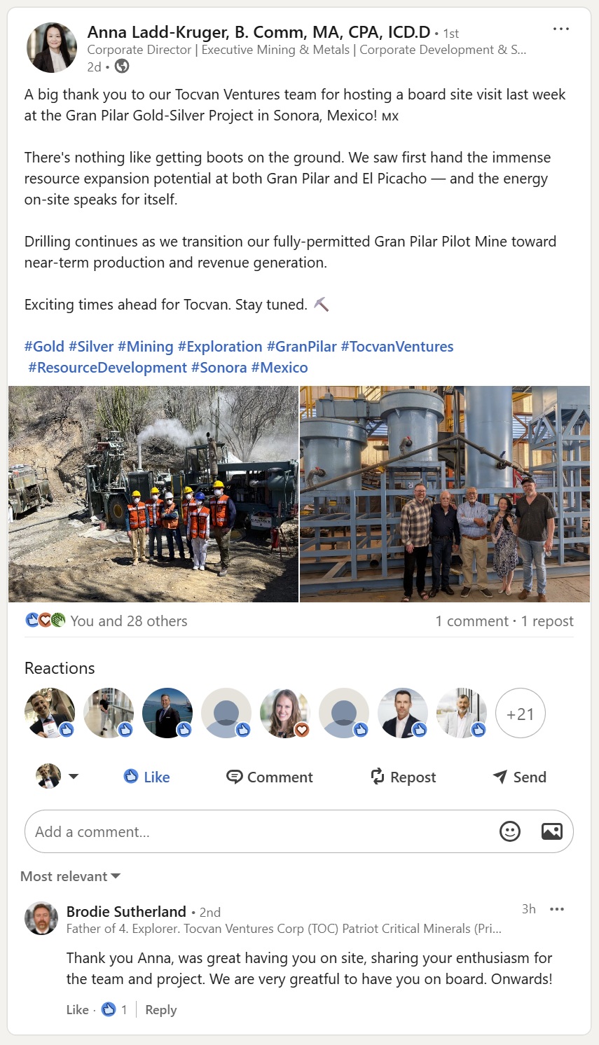 A second image shared by Brodie shows the Tocvan team in front of a processing plant, including newly appointed Director Anna Ladd-Kruger, who recently commented publicly on the latest site visit to the Gran Pilar Gold-Silver Project. The message is straightforward: The board and management are engaging on site, while the company advances the next stage of execution.